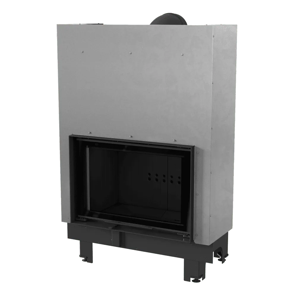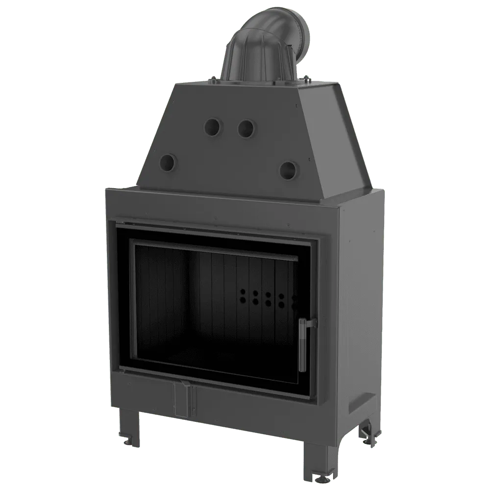 - Hoge schoorsteen en dwars geplaatste rookbuis vergroten het gebied van warmte-uitwisseling tussen het inzetstuk en de omgeving.